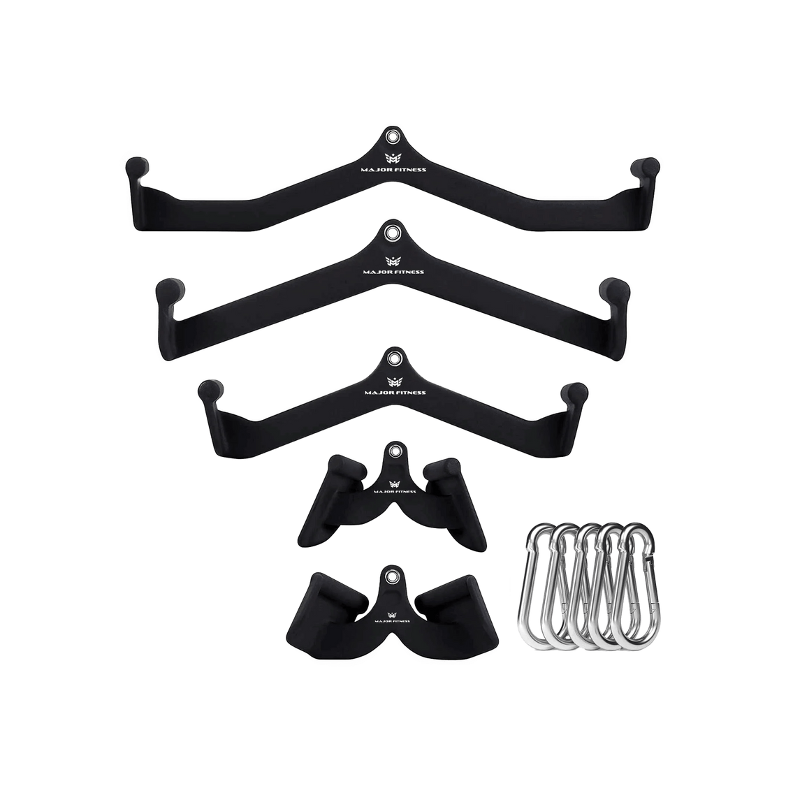Our cable pulldown bar set features handles in various styles, including row bars, lat bars, bicep bars, and tricep bars. They can each target muscles in your upper body from a different angle, enabling you to obtain the ideal physique. Compatible with most pulley machines with universal attachment points, such as the B52 Smith machine, and they’re easy to install. Take a lat pulldown bar and clip its carabiner to the metal ring on your machine and start lifting!