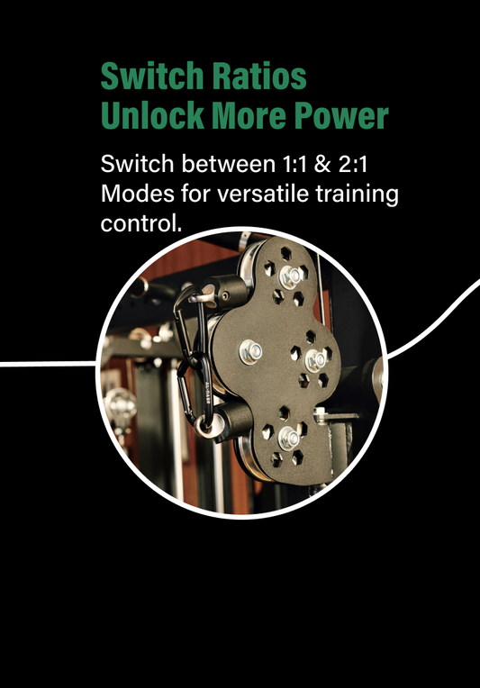 Users can pull one cable to engage the 2:1 ratio for lighter resistance and longer cable travel, or pull two cables simultaneously to activate the 1:1 ratio for direct heavier resistance. This intuitive design allows users to adjust training intensity seamlessly without mechanical changes mid-workout.