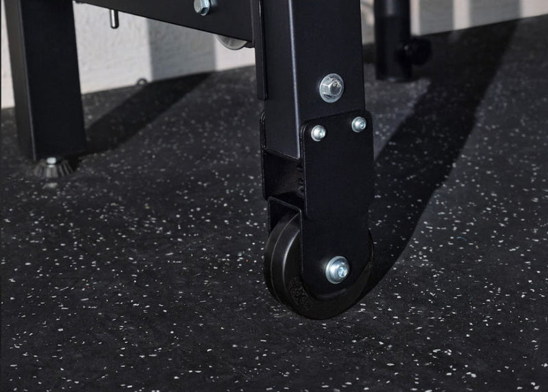 XL rubber wheels and one-person operation let you seamlessly switch your space between gym and daily use in minutes all while providing rock solid stability.