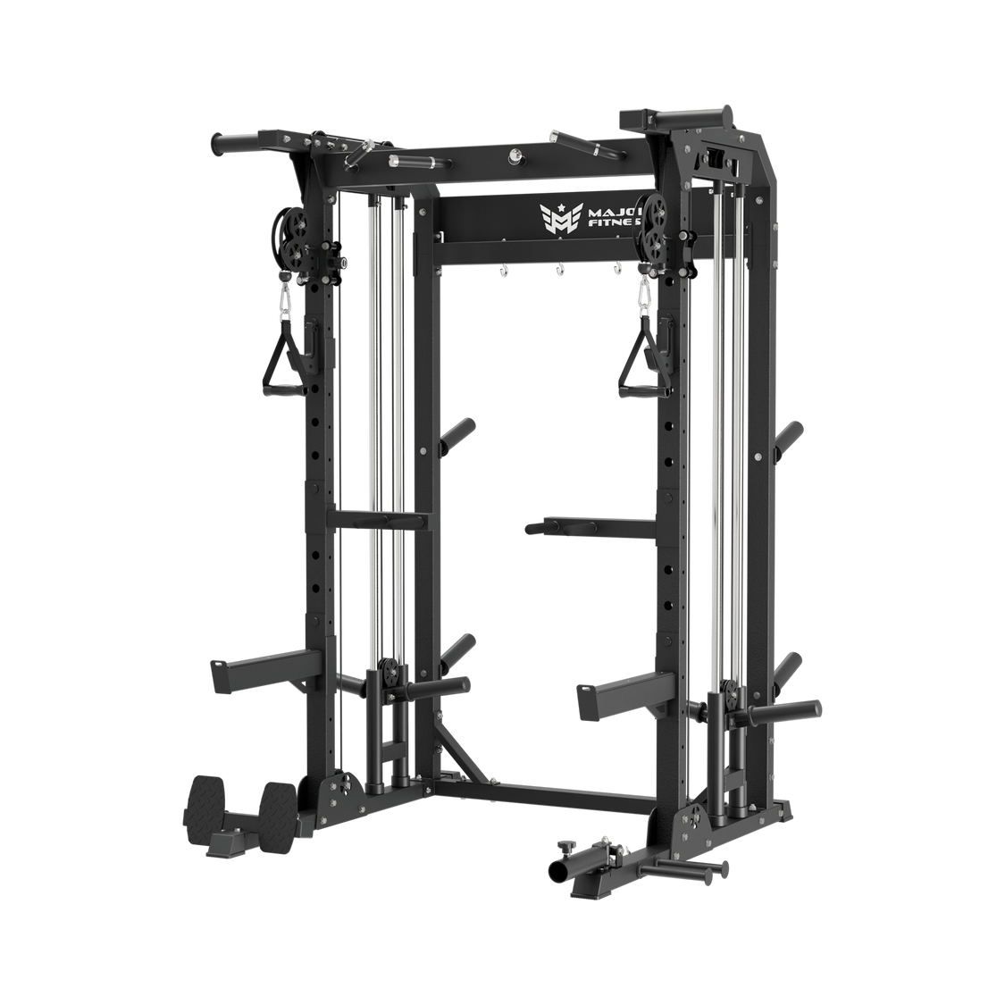 The Major Fitness F22 is an all-in-one power rack with a dual cable pulley system, pull-up bar, and 380 landmine. With this multifunctional power rack, you can do over 80 exercises at your home gym, from strength training to functional workouts.